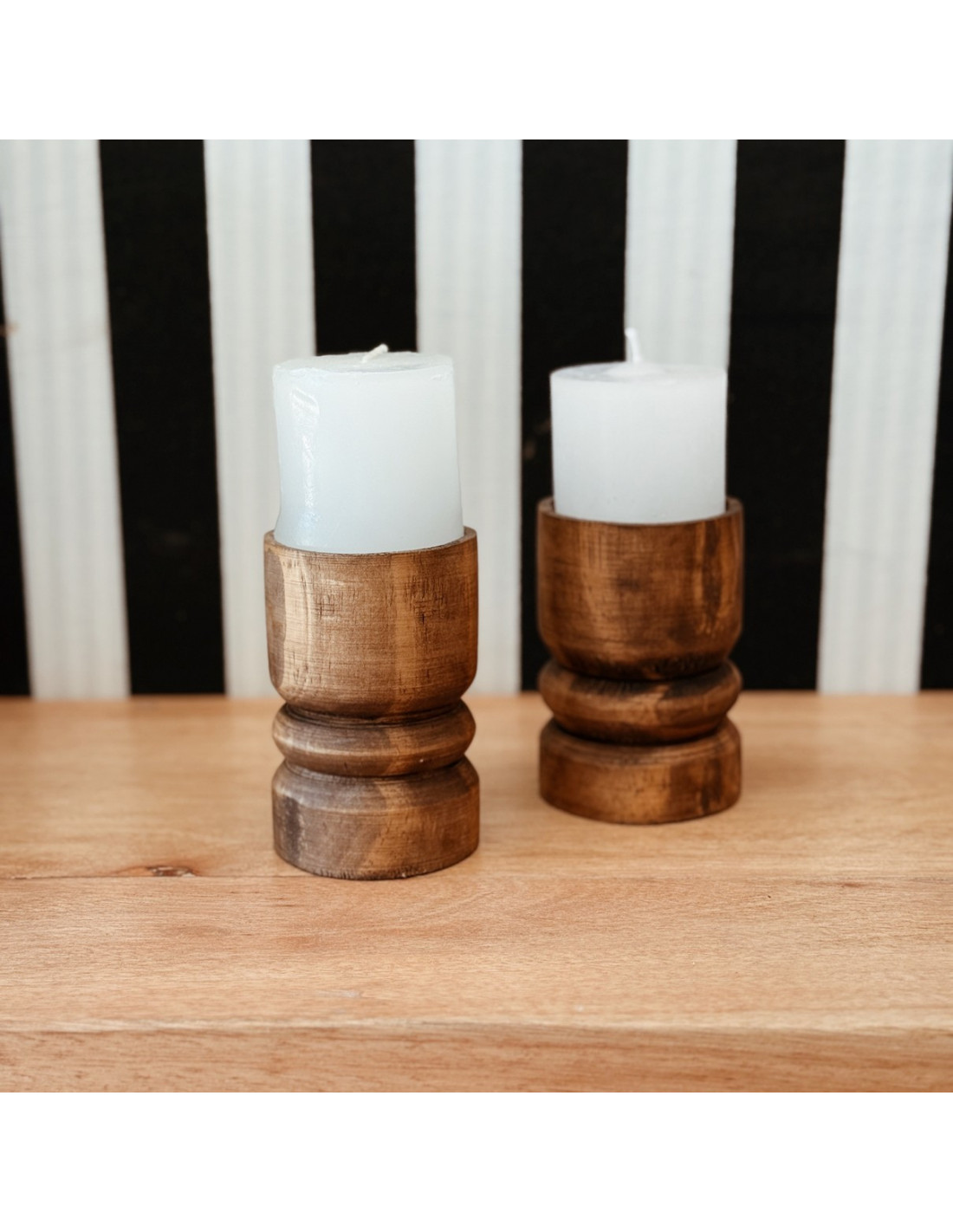 SET de 2 Porta Velas hechos en madera maciza, torneados a Mano. Altura 15 cm, diametro 7.5 cm aprox. Incluye VELA
